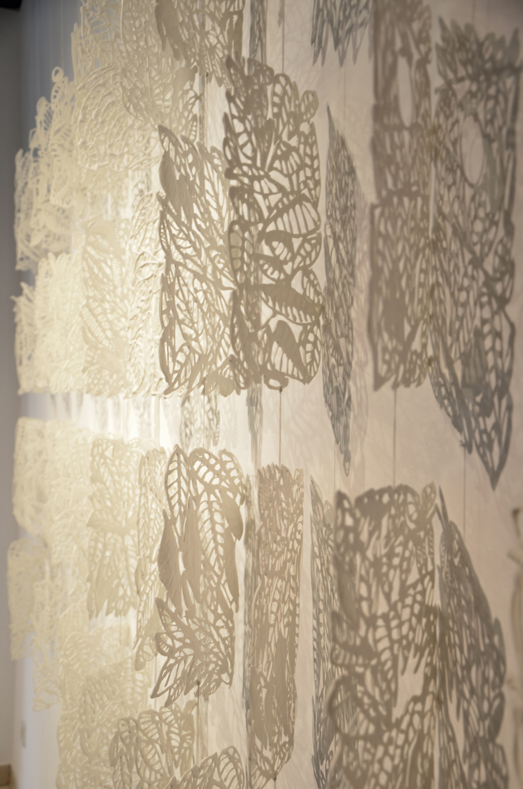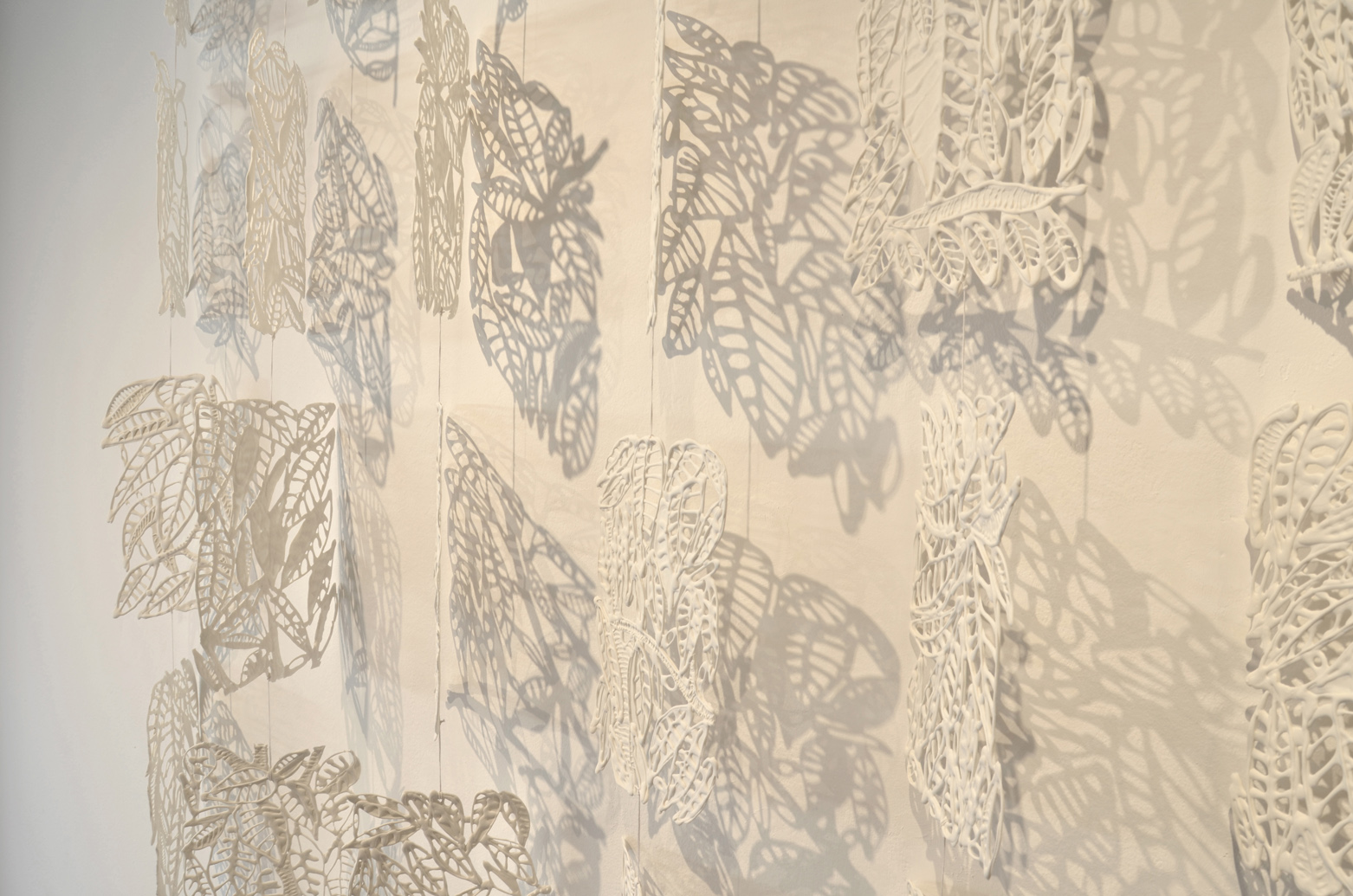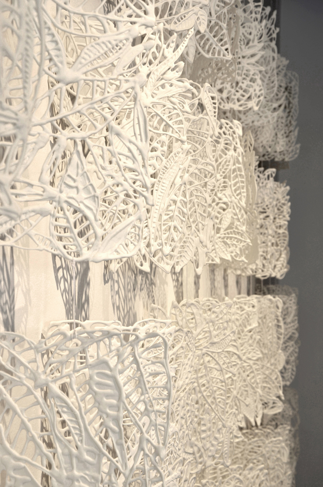 A partir de la fragmentació d’una fotografia del taronger que veig des de la finestra del meu estudi, plantejo aquesta composició de 48 peces realitzades mitjançant una barbotina de porcellana. Les peces de porcellana projecten la seva ombra sobre la paret, creant el meu particular komorebi.