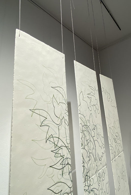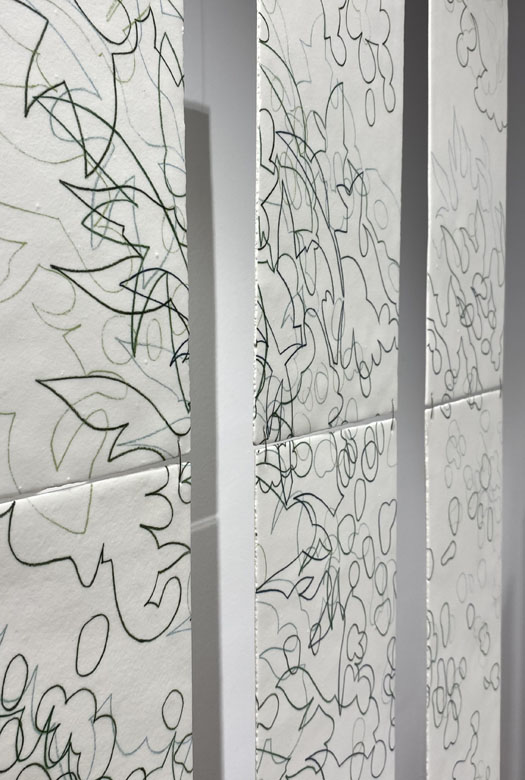 Aquesta peça reprodueix el dibuix d’una seqüència d’ombres del taronger projectades al vidre de la finestra del meu estudi. La idea inicial era captar l’ombra projectada de l’arbre sobre el vidre, però quan em vaig posar a la feina, em vaig trobar amb la sorpresa que quan estava acabant el dibuix de l’ombra, aquesta havia canviat per totalment i només havia passat un moment. La sensació de vertigen va ser immediata i, per descomptat, aquest fet va marcar el projecte. Cada traç té un color que es correspon a un instant i el temps aproximat entre cadascun dels traços, és de dos minuts, que és el que trigava a retratar l’ombra completament.